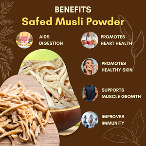 Safed Musli Powder (botanical name: Chlorophytum borivilianum) is a traditional Ayurvedic herb widely used for its adaptogenic, aphrodisiac, and general health-boosting properties. It's known for its high nutritional and medicinal value, especially in the form of powder.
