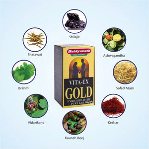 Baidyanath Vita-Ex Gold Capsule is a proven unique formulation fortified with gold and other powerful bhasma, for stronger and sustained stamina and vitality. It’s made using ancient knowledge and is a complete ayurvedic medicine. Baidyanath Vita EX Gold Ex Plus Capsules enriched with powerful ayurvedic herbs, like shudh shilajit, ashwagandha, keshar (saffron), safed musli, kaunch beej, vidari khand and 15 others essential and powerful herbs are well-known and very useful in restoring energy, for improved and sustained power and stamina, vitality and vigour in the body. Baidyanath Vita EX Gold Plus Capsules rejuvenate the reproductive system, calms the brain, helps in maintaining vitality in men. In today’s hectic life our body starts losing its working capabilities and starts feeling tired that leads to fatigue, but regular use of natural and efficacious ingredients poured Baidyanath Vita-Ex Gold Plus capsules, rich with powerful antioxidants, proteins and minerals, helps to manage life’s daily stress, anxiety and keeps the body active through the day.