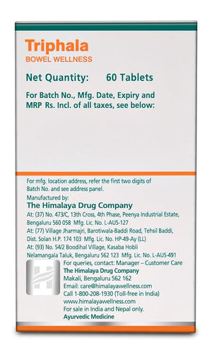 Himalaya Wellness Pure Herbs Triphala Bowel Wellness Tablet / For Constipation & Stomach Care is an herbal supplement that aims to support digestive health and relieve constipation. Triphala, which is a combination of three fruits - Amalaki (Emblica Officinalis), Haritaki (Terminalia Chebula), and Bibhitaki (Terminalia Bellirica), is known to provide a gentle pro-kinetic effect on the bowels. This herbal blend is believed to help regulate bowel movements and relieve long-standing constipation.