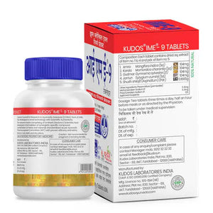 Kudos IME 9 Tablet is a proprietary formulation containing a blend of botanical ingredients known for their role in supporting metabolic wellness. The formulation includes Amra, Karela, Gudmar, Jamun, and Shudh Shilajit, which may support beta cell activity, helping maintain balance in sugar metabolism.. Each tablet contains a standardised extract of the key botanical ingredients, providing consistent composition. This formulation can be a part of a structured lifestyle approach, including a balanced diet, regular exercise, and routine healthcare check-ups. A diet chart and recommended yoga asana leaflet are included in the pack to complement overall wellness.
