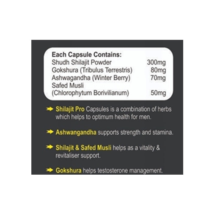 Shilajit Pro Capsules are herbal supplements formulated with purified, Ayurvedic Shilajit along with classical plant synergists. Key combinations include ingredients such as Ashwagandha, Gokshura and Safed Musli etc for enhanced vitality and wellness.